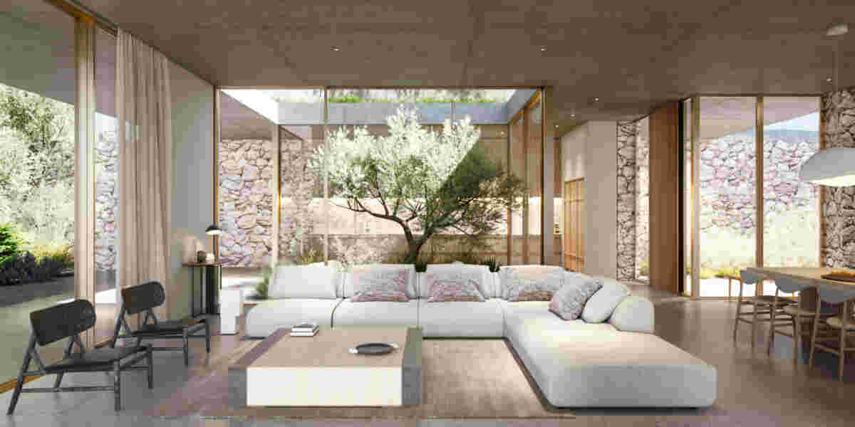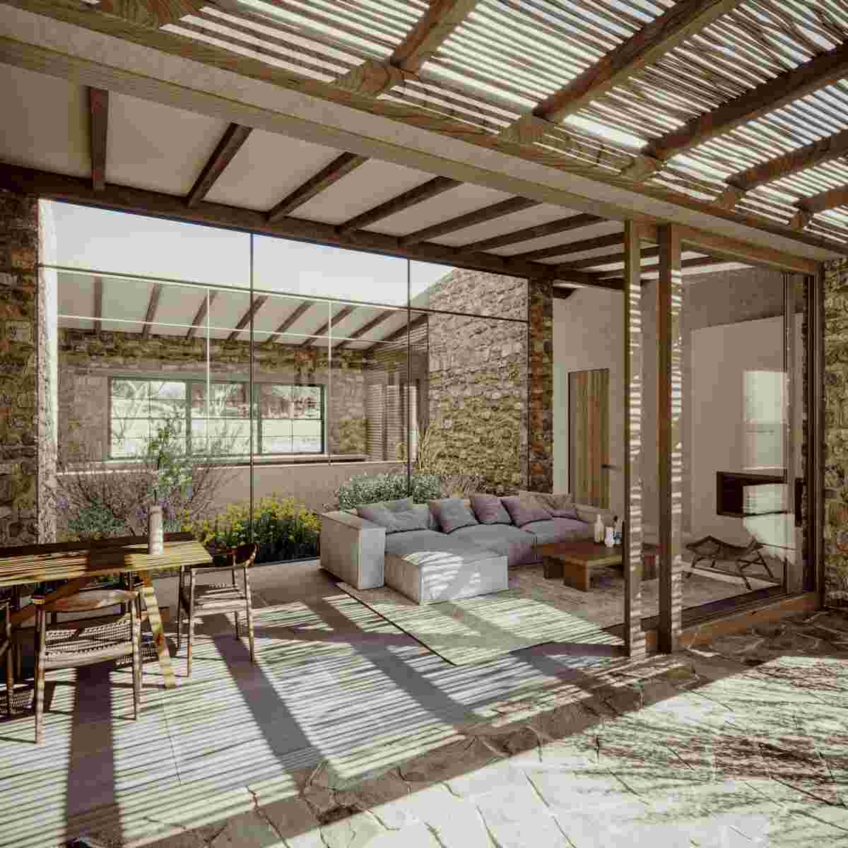 Οι υπαίθριοι διαμορφωμένοι χώροι περιμετρικά της κατοικίας είναι φυτεμένοι και προσαρμοσμένοι στο ευρύτερο φυσικό περιβάλλον, με στόχο την ελάχιστη αλλοίωση της υφιστάμενης κατάστασης του φυσικού περιβάλλοντος και την αρμονική ενσωμάτωσή τους. Κύριο χαρακτηριστικό είναι η εναλλαγή κλειστών και ανοιχτών χώρων, για άνετη διαβίωση καθ’ όλη τη διάρκεια του χρόνου.