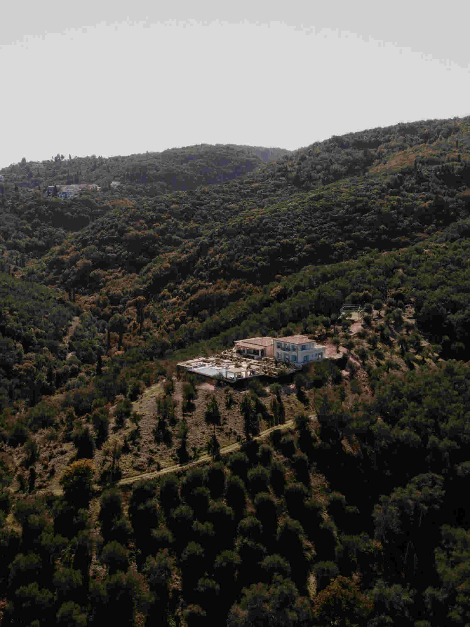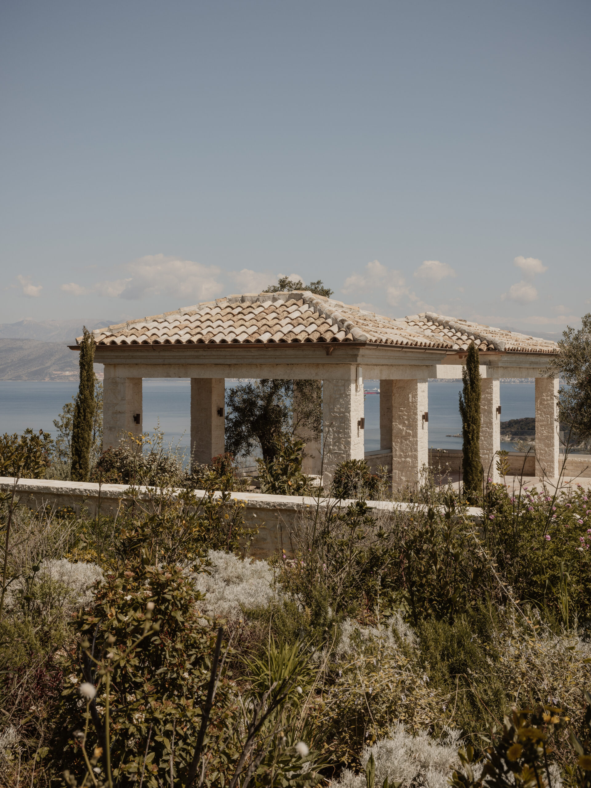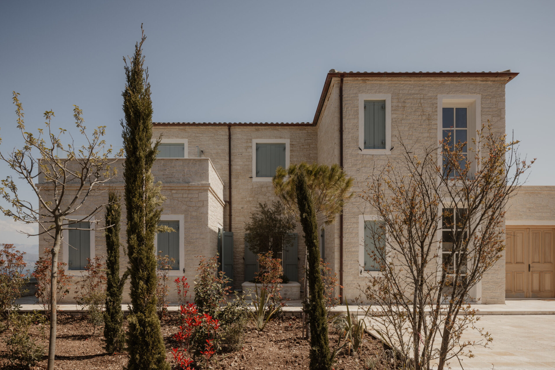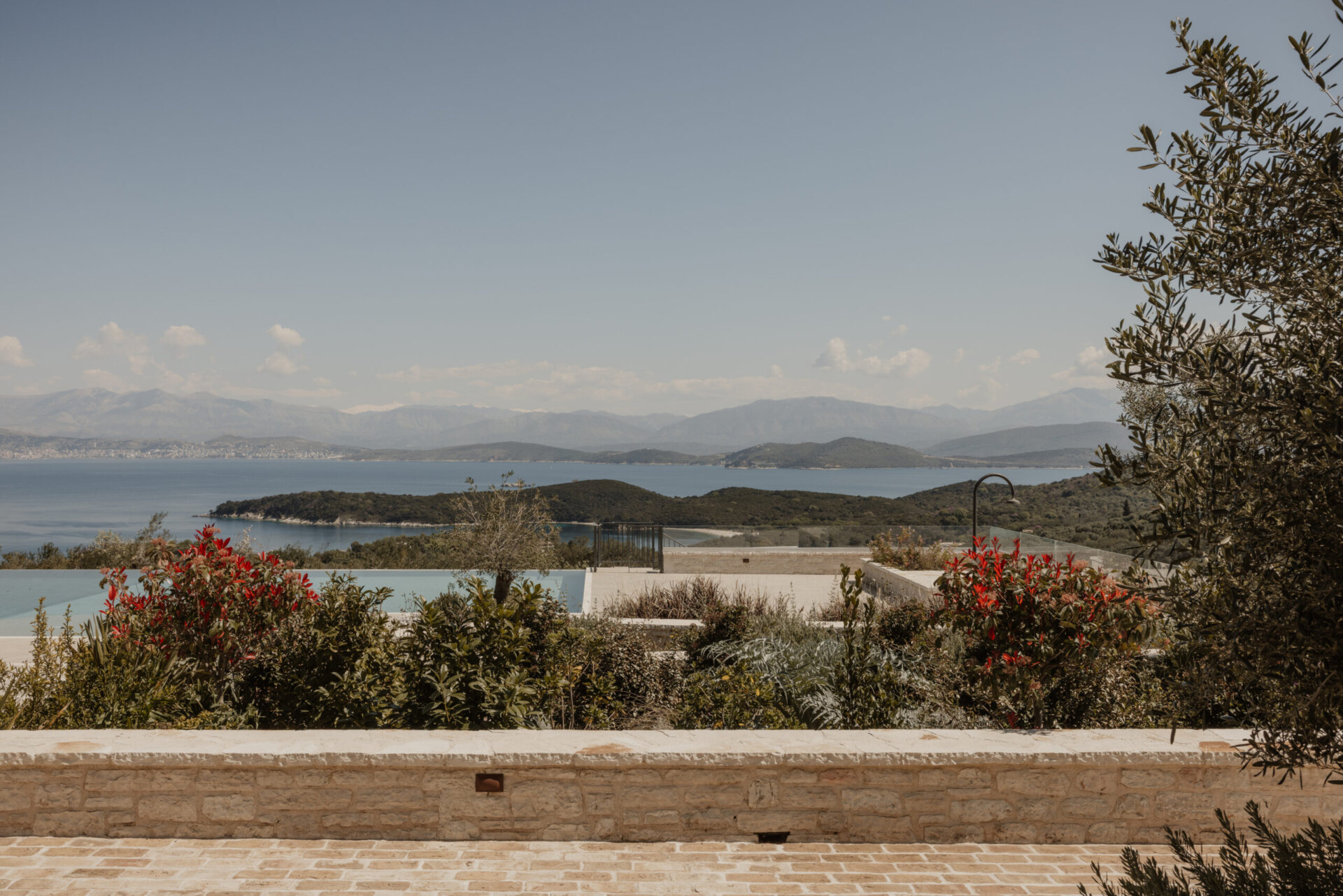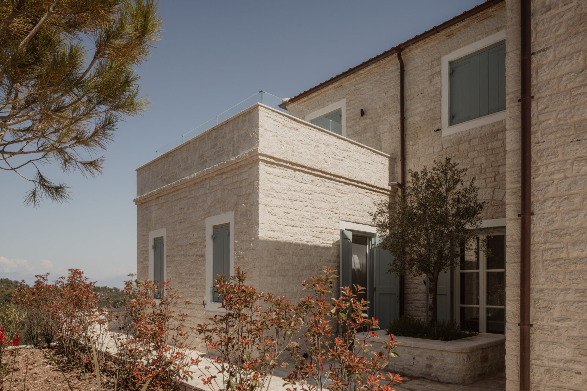 Villa Beliha is situated on a hillside overlooking the adriatic sea, a scenic view with the mountainous terrain of Albania in the background. The foreground features olive trees, characteristic of Mediterranean landscapes. The residence combines traditional and contemporary architectural elements, featuring a stone facade and a sloped roof. This approach seamlessly integrates heritage-inspired features with modern design principles, achieving a balanced and timeless aesthetic.